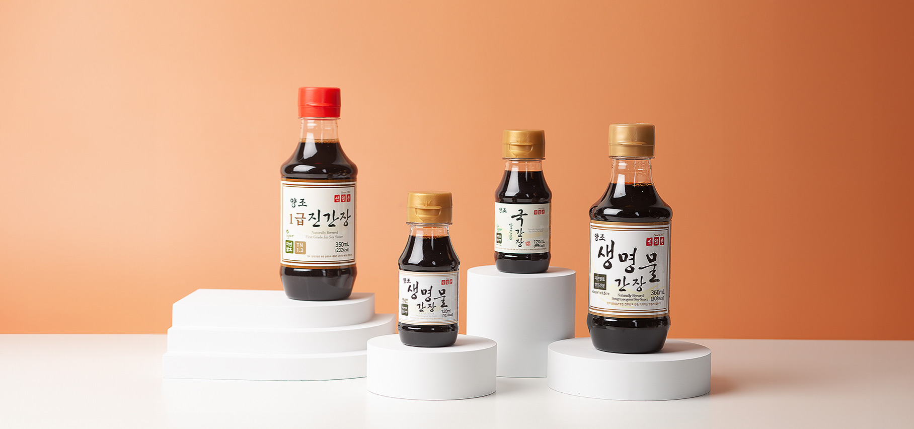Brewed soy sauce is made by fermenting and aging soybeans or fat-free soybeans and grains for a long period of time by inoculating them with selected bacteria instead of meju. It is characterized by a long production period of more than six months, a unique deep and mellow flavor and aroma originating from microorganisms, and a very rich, sweet taste and dark color.